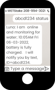 All WET Stake settings can be adjusted via text messaging. Send a text to the number located on the side of the WET Stake. Include the device ID (found under the name) along with any necessary commands. Note that both the ID and commands are not case sensitive.